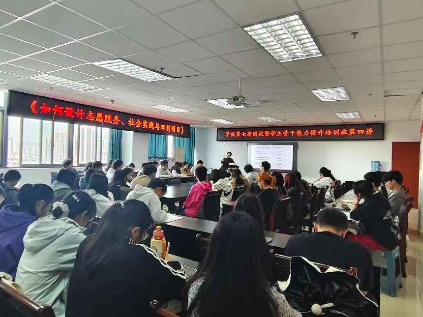 为持续提升院党团学组织的建设水平,进一步增强学生骨干在志愿服务、社会实践及双创项目设计上的能力,学院团委于3月26日中午在七教1011会议室举行了第七期团校暨学生骨干能力提升培训班第四讲,共计70余名党团学组织骨干参与此次培训。