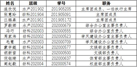 全院同学: 按照《学院关于党团学组织主要学生干部换届调整的通知》相关要求,经学生自主申报、各部门、团支部初审推荐、换届工作领导小组进行资格复审及面试,由学代会通过后报经学院团委同意、学院党委确定,现将第十五届学生会主席团成员及工作部门(主要)负责人名单公布如下: