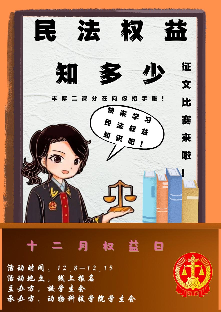 为了加强同学们对法律的认识,增强同学们的维权意识,2021年12月8日至12月15日,新葡的京集团8814学生会与校学生会权益部联动,举办了“民法权益知多少”征文比赛。