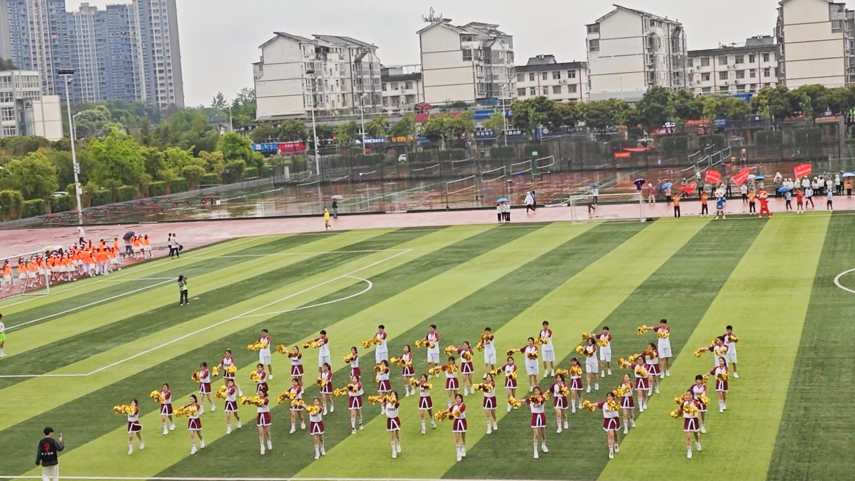 比赛当天,尽管下着淅淅沥沥的小雨,但丝毫没有削弱健美操队的满腔热情,她们个个容光焕发,技术娴熟,展现出了神采飞扬的精彩舞姿,难以忘怀的无限魅力。身着红色队服,手举金色彩球的动科健儿们,将每一步每一个动作精准地踩在音乐节奏上。并跟随着音乐的鼓点,进行复杂且多变的队形转换。他们的动作张弛有力,干脆利落,洋溢着热血澎湃的激情,绽放着活力四射的青春。“踩,踩,踩,踩,跟我踩!”动科健儿们如音乐内容那般用力踩出了奋斗,踩出了青春,踩出了自信。他们身上散发出的自信光芒,盎然生机,令人目不暇接,过目难忘。