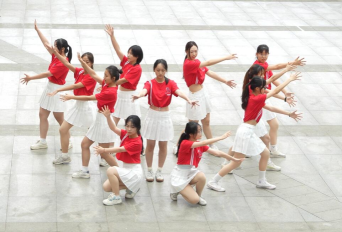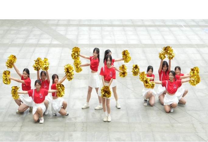 比赛场地上,参赛队员身着统一的服装互相加油打气,彼此鼓励。与此同时,摄影组的成员准备好专业的摄影设备进行拍摄,现场的观众欢呼声也将赛场的氛围烘到顶点。伴随着音乐的响起,参赛队员纷纷以饱满的精神状态做出有力娴熟的动作,她们跳跃、落下,姿势优美大方,节拍有力分明,向观众呈现力与美交织的舞蹈盛宴。