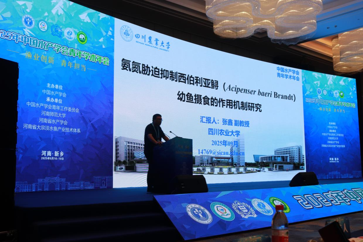 水产学科青年教师张鑫副教授、曹全全副教授带领研究生参加了本次会议。冷水鱼健康养殖团队师生代表进行墙报展示和分会场报告呈现了团队在鲟鱼健康养殖方面的最新研究成果。张鑫作了题为《氨氮胁迫抑制西伯利亚鲟幼鱼摄食的作用机制研究》的大会报告,解析了氨氮胁迫对西伯利亚鲟摄食行为及脑功能的影响,为揭示氨氮对水产动物的神经毒理机制提供了新的科学依据。研究生孙慧敏和袁梦彬分别做了题为《氨氮胁迫对西伯利亚鲟幼鱼肠道健康影响的初步研究》和《BDE-47通过整合素介导的氧化应激与炎症通路引发西伯利亚鲟胚胎毒性》的报告,并于与会研究生们交流了研究思路和前沿技术。团队博士毕业生、博士后唐妮分享了其在四川省水产研究所的最新研究进展《基于摄食调控视角解析转食期长江鲟生长分化的分子机制》,揭示了长江鲟在转食阶段的生长差异及其基因调控机制,为长江鲟的人工繁育与精准投喂提供了理论支持。曹全全作了题为《美洲鳗鲡的低渗适应策略》的报告,系统阐述了美洲鳗鲡在低渗环境下的生理调节机制与分子响应途径,研究成果对咸淡水养殖品种的驯化与健康管理具有重要的参考价值。