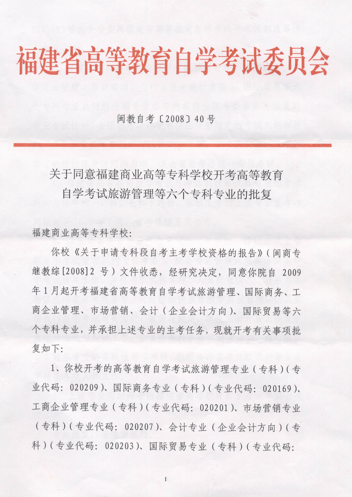 闽教自考(2008)40号关于同意我校开考自学考试会计等六个专科专业的批复