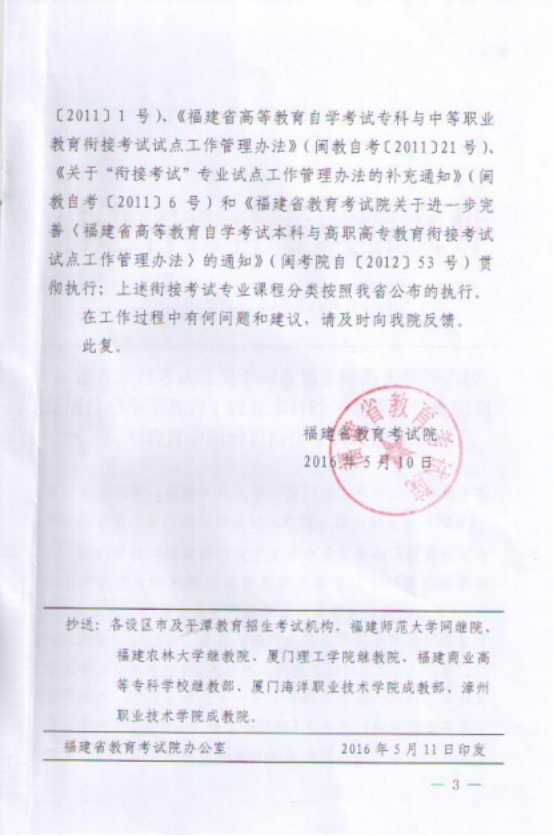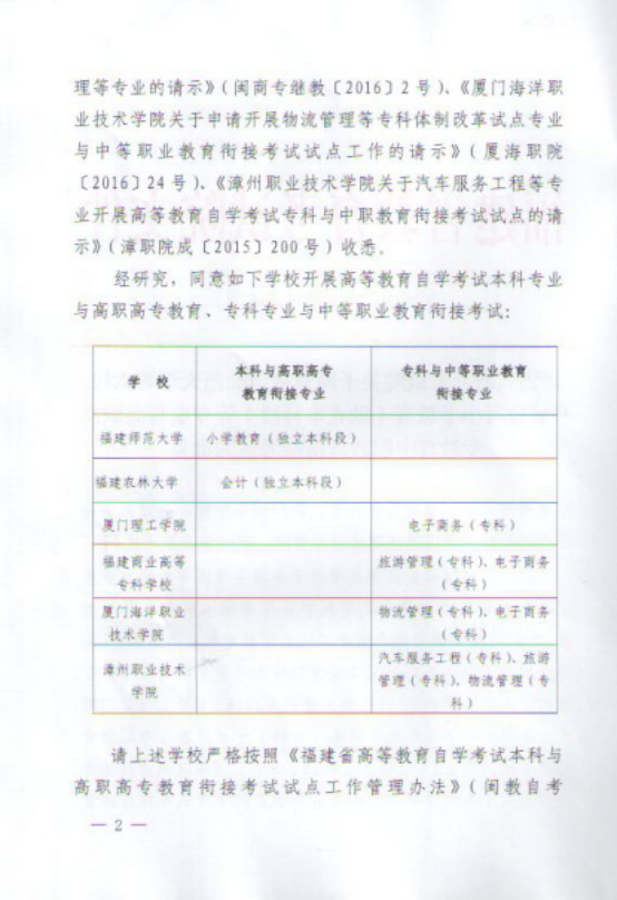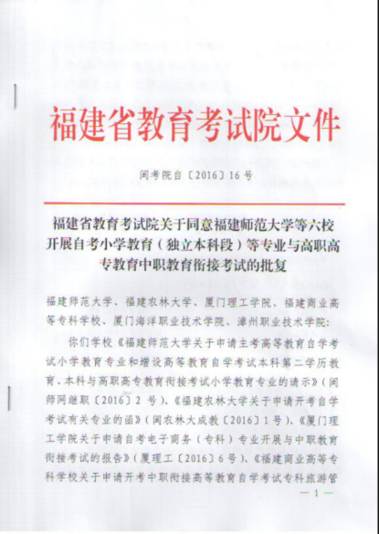 闽考院自[2016]16号 福建省教育考试院关于同意福建师范大学等六校开展自考小学教育(独立本科段)等专业与高职高专教育中职教育衔接考试的批复